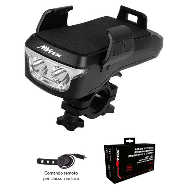 Fanale Anteriore LED Portacellulare Power Bank 650LM USB Nero - Batteria al Litio 4000mAh con Comando Remoto a Filo MVTEK